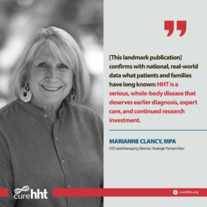 “This publication is a landmark moment for the HHT community,” says Cure HHT Chief Executive Officer Marianne Clancy, MPA. “It confirms with national, real-world data what patients and families have long known: HHT is a serious, whole-body disease that deserves earlier diagnosis, expert care, and continued research investment. We are proud that Cure HHT was able to launch the CHORUS registry, and we are hopeful this publication will help drive better awareness, better care, and better outcomes for families living with HHT.”